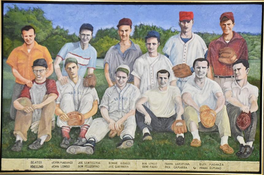 (Kiwanis) Municipal League Knights of Columbus team in the late 1950s. From left, front row: Ray Slogar Sr., Al Pakish, Faye Billings, Joe White, John Giaquinto; middle: John Bringantino, Tony "Bull" Fabbio, George Fanelli, John Alliasso, Fran DeJoseph, Dick Robertello back: Fran Kraus, Steve Gigliotti, Dan Falatico Sr., Junior Romano, Jack Paparella; bat boy: Ray Slogar Jr.