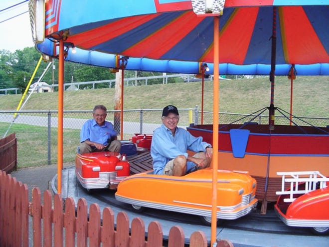 Native Uticans Dick and Bob Chancia enjoy their favorite attraction during a recent visit to Sylvan Beach.